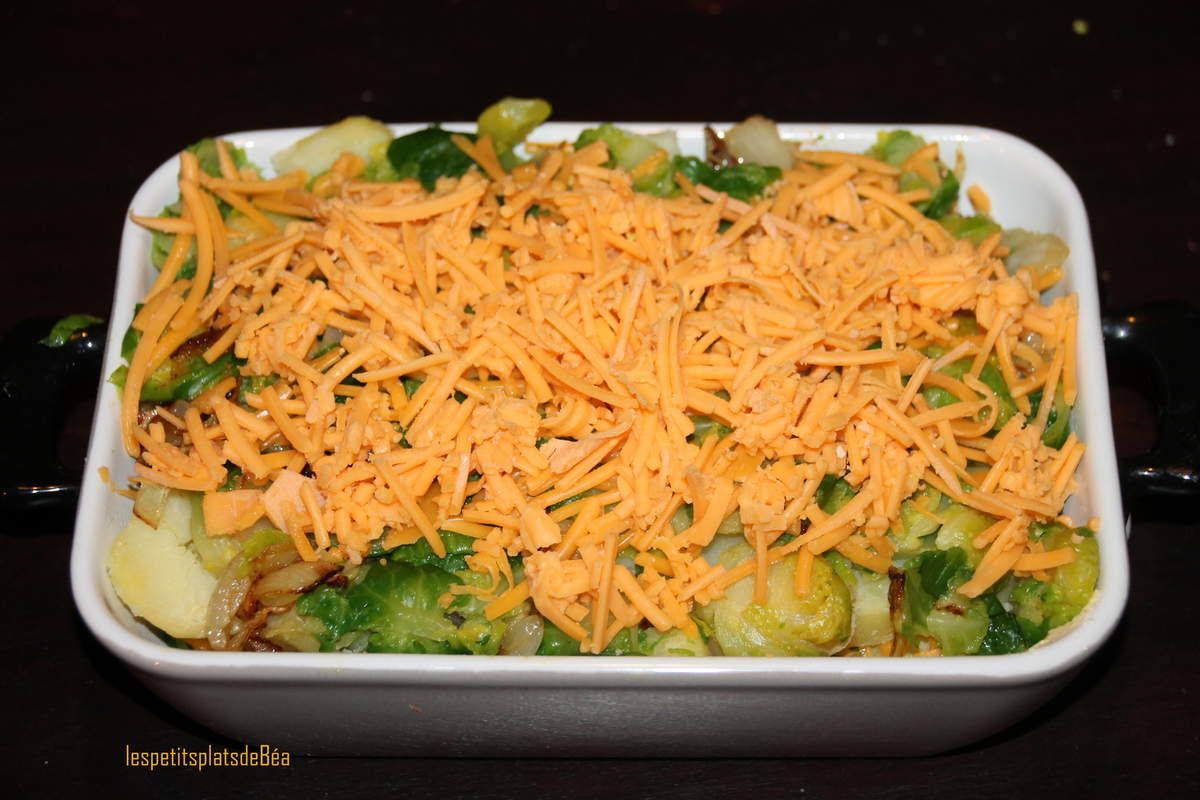 Beurrer un plat à gratin, poser la moitié des pommes de terre, la moitié des choux de Bruxelles, la moitié de l'oignon puis couvrir de la moitié du cheddar.