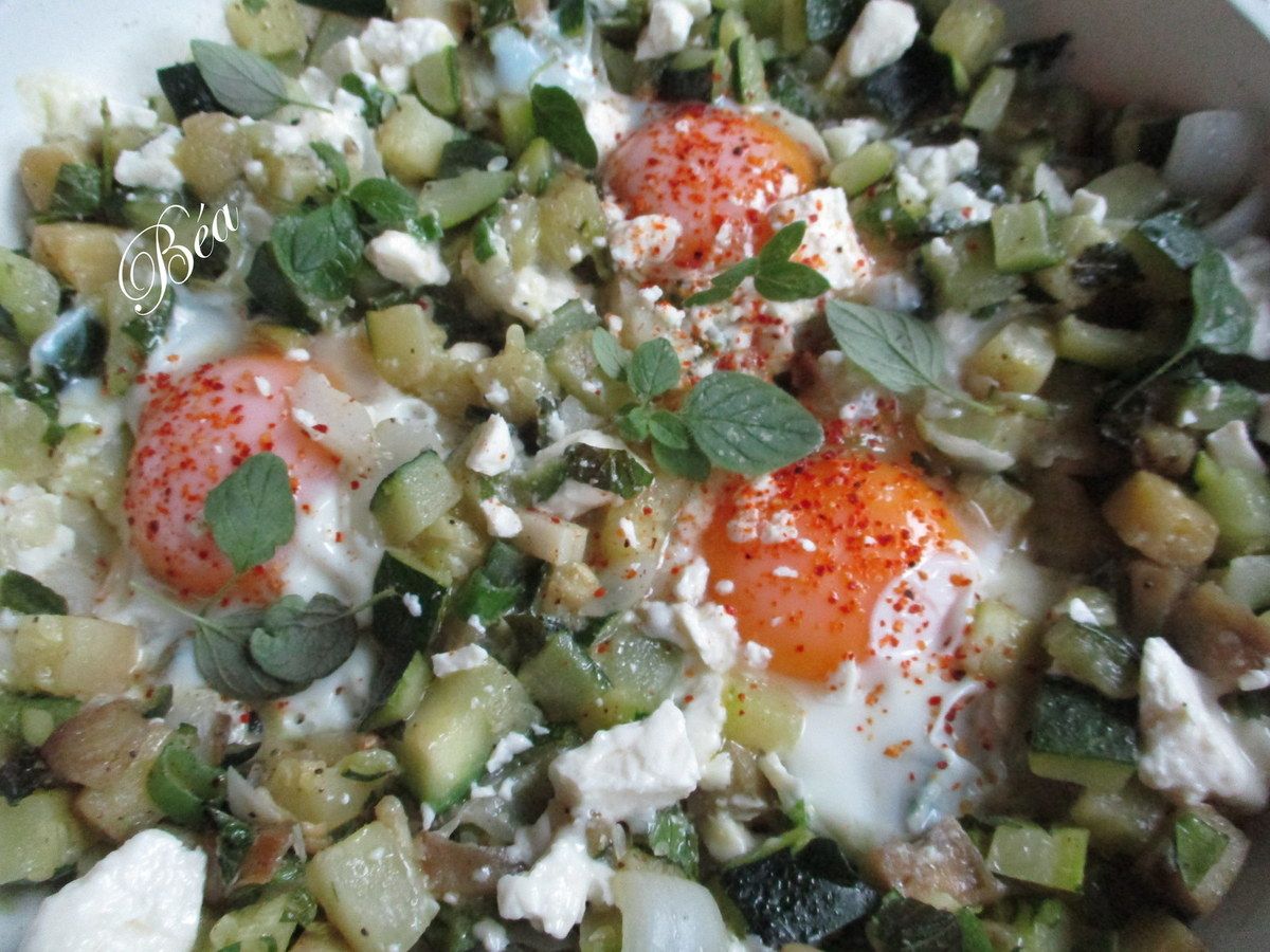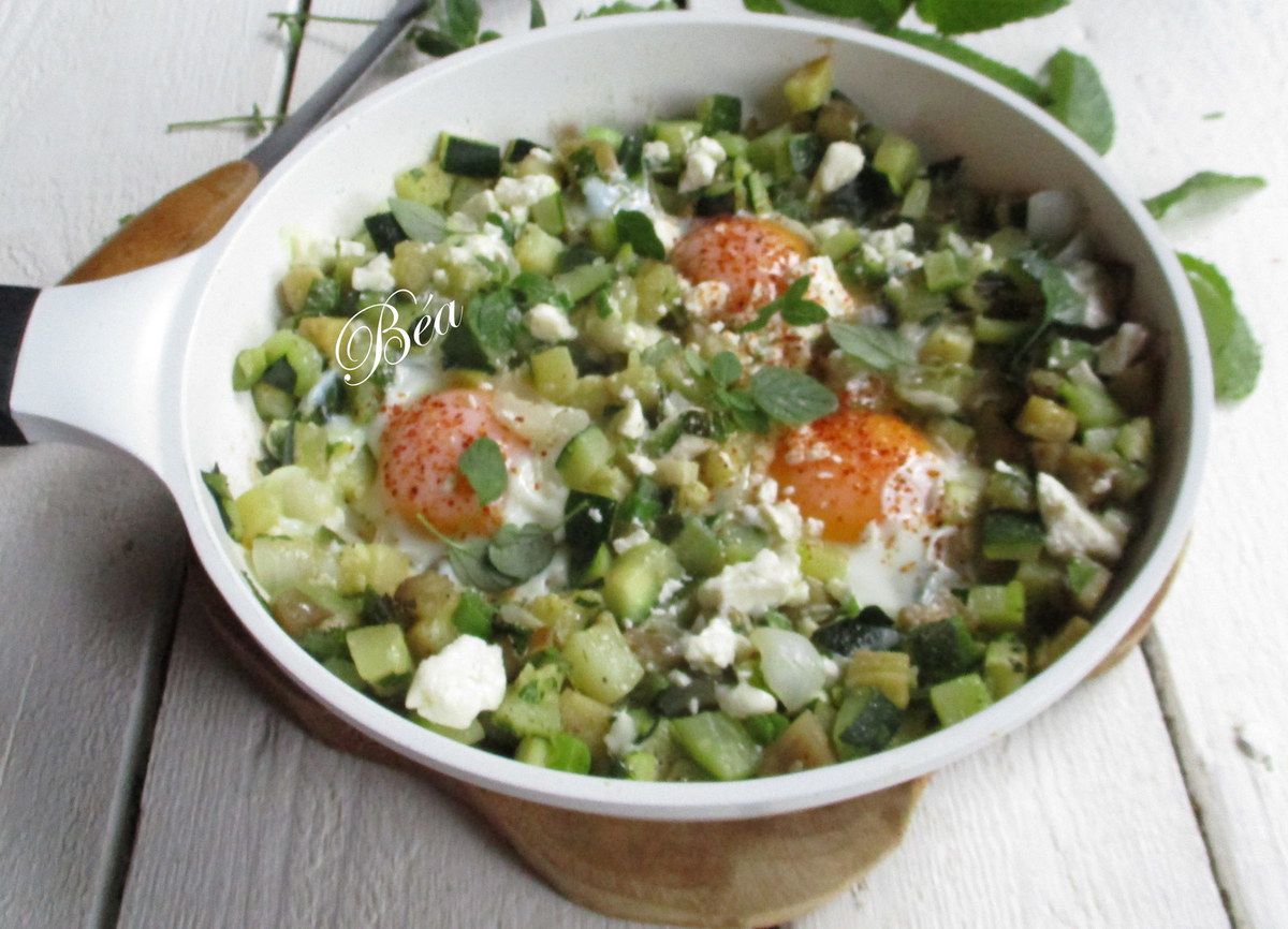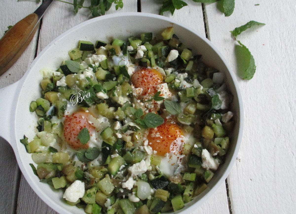 C'est une revisite complète de la chakchouka où les tomates et les poivrons sont remplacés par des courgettes, une agréable manière d'utiliser ce légume qui foisonne sur les étals et dans les jardins en cette saison. Et pour aller jusqu'au bout de la revisite j'y ai incorporé de la féta.
