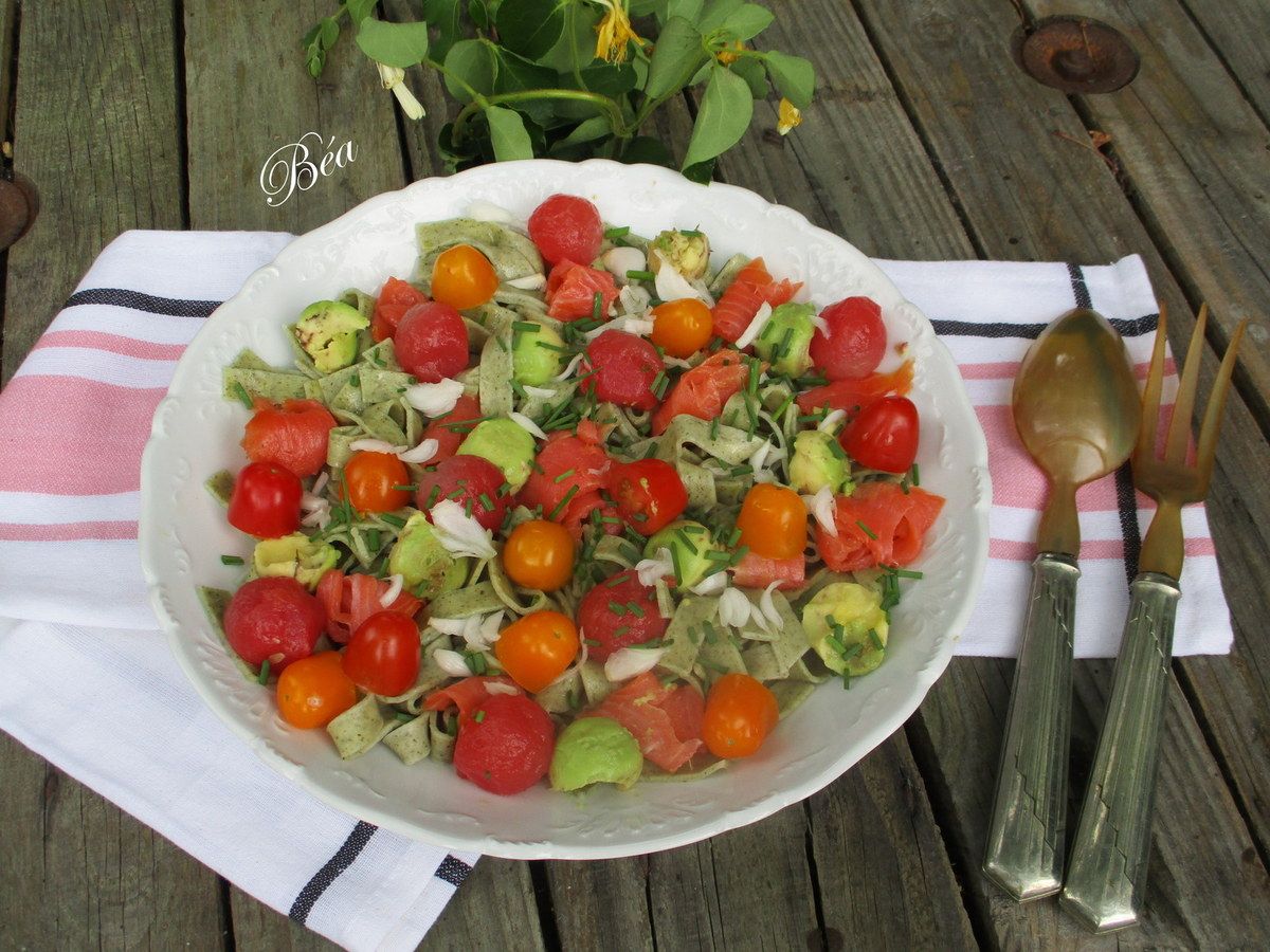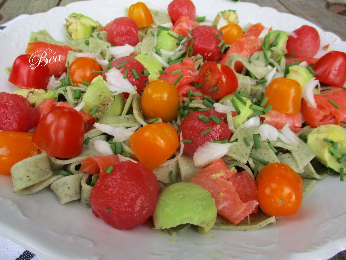 On y trouve des pâtes ici parfumées à l'ail des ours mais peu importe, de la truite fumée, des billes d'avocat mûr à point, des tomates cerises, quant à la vinaigrette elle est très classique juste moutarde 4 huiles mêlées, citron et vinaigre balsamique blanc.