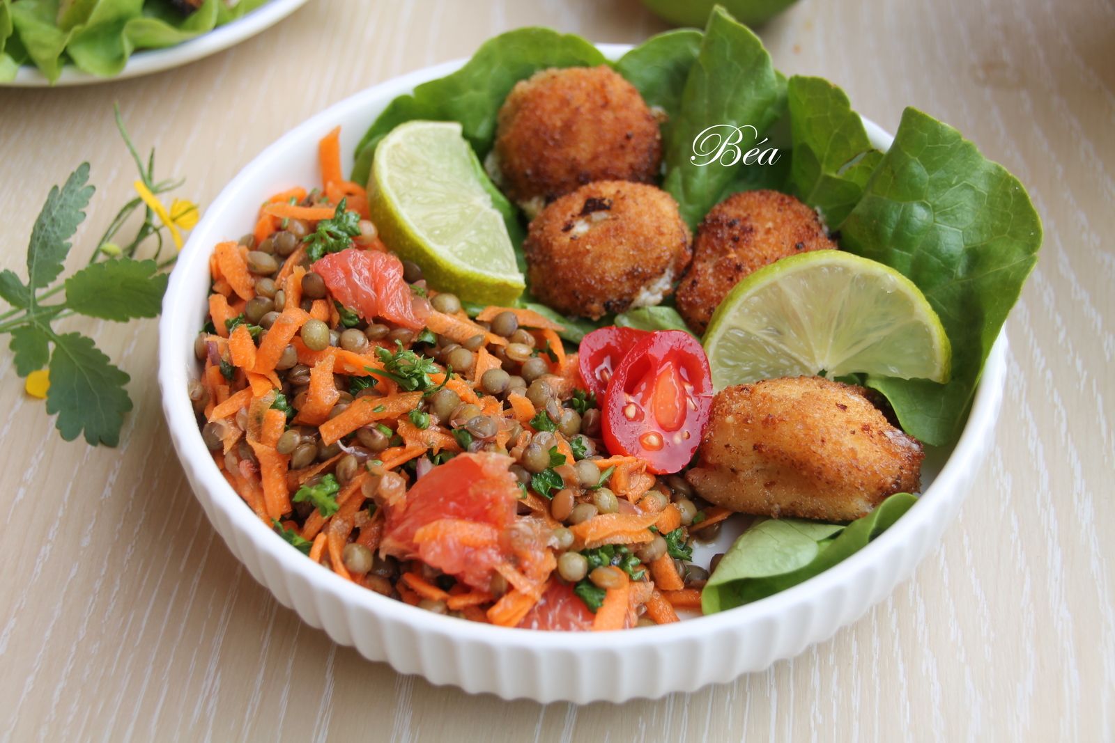 Salade de lentilles carottes et pamplemousse, croquettes de féta au miel et aux herbes